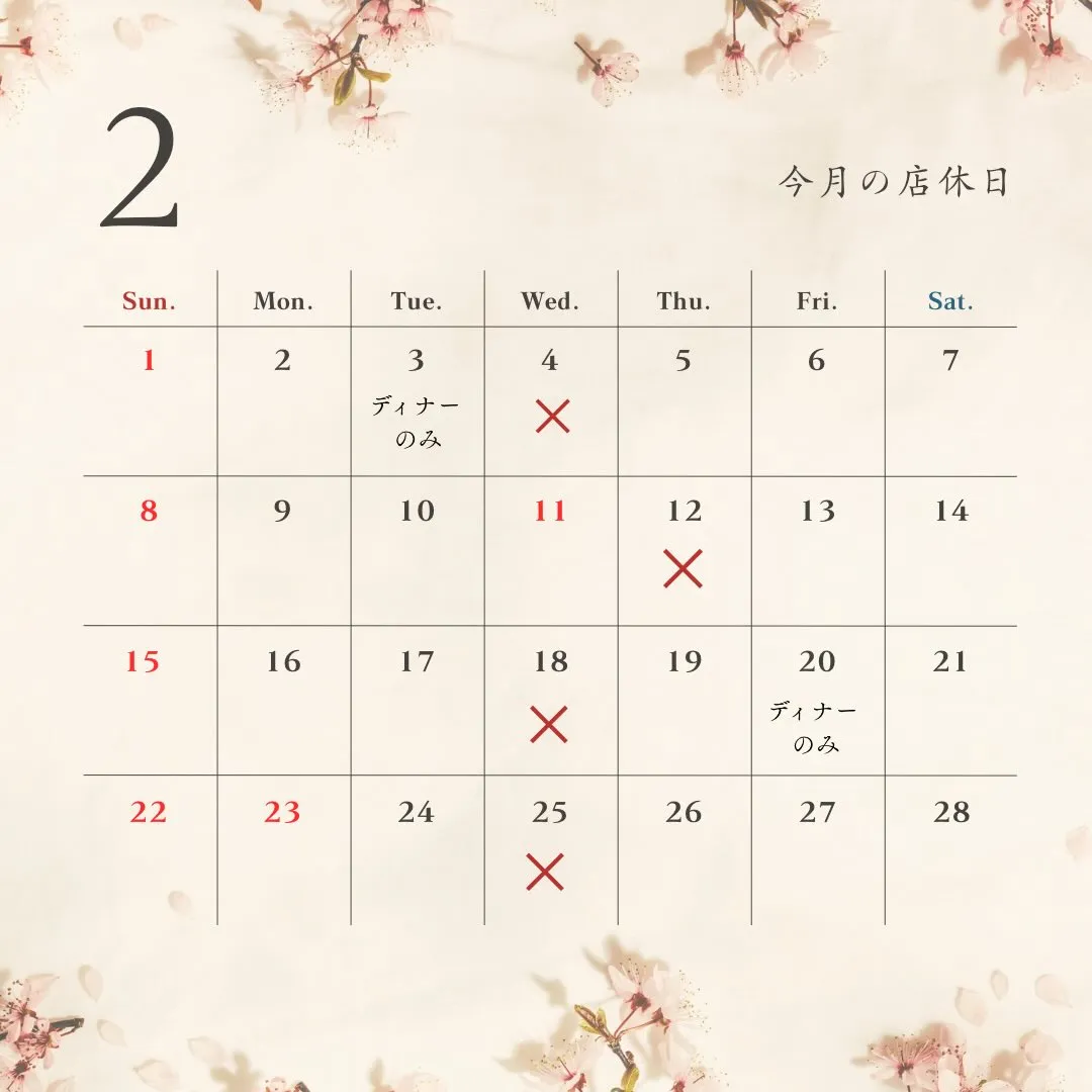 2月は変則店休になりますのでご確認くださいませ!